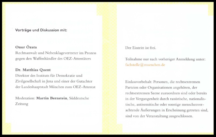 Eine Anmeldung ist nicht erforderlich, doch bitte beachten Sie den Einlassvorbehalt: Personen, die rechtsextremen Parteien oder Organisationen angehören, der rechtsextremen Szene zuzuordnen sind oder bereits in der Vergangenheit durch rassistische, nationalistische, antisemitische, antiziganis-tische oder sonstige menschenverachtende Äußerungen in Erscheinung getreten sind, sind von der Veranstaltung ausgeschlossen. Die Veranstalter behalten sich vor, von ihrem Hausrecht Gebrauch zu machen.